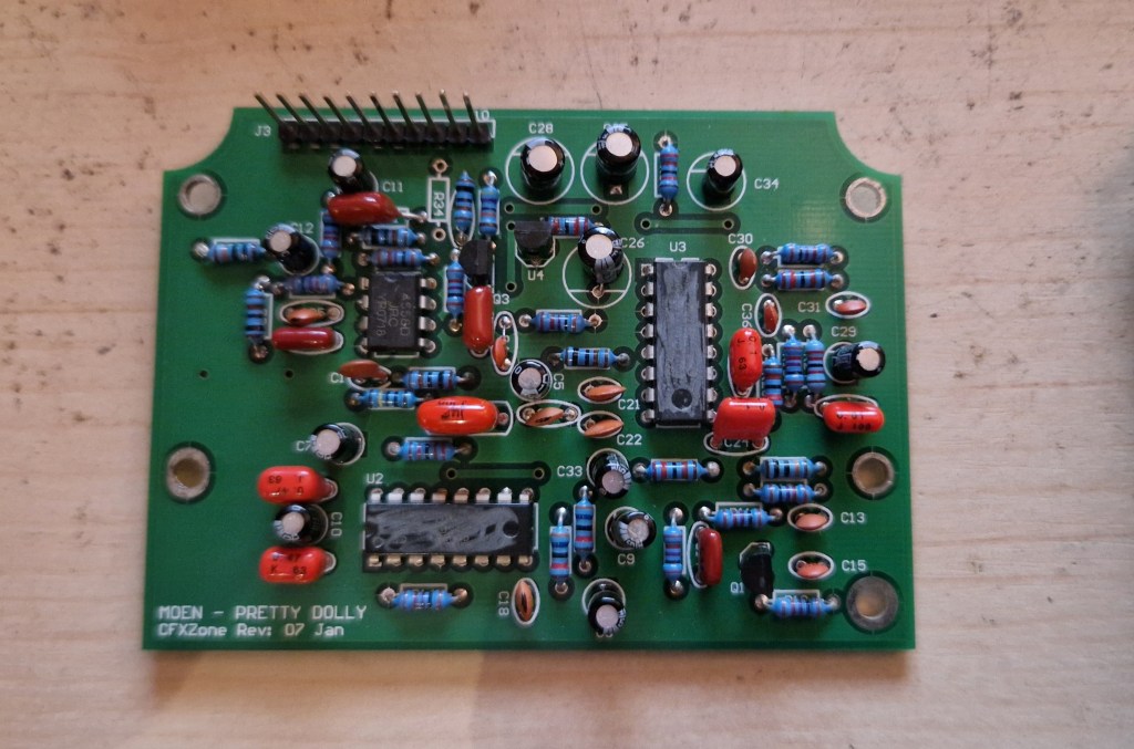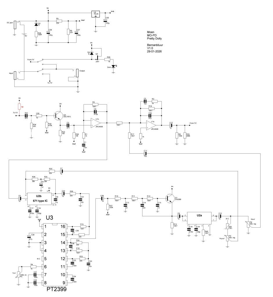 I quickly recognised this pedal! It is a clone of the PT-80 delay (with an added input buffer), a DIY design by Scott Swartz that can be found online on various platforms. PCB’s are widely available. Officially this design was introduced in 2002 on GGG (General Guitar Gadgets) and is still available up to this date. The documents on this website give a lot of info on the design and realisation of the pedal.
