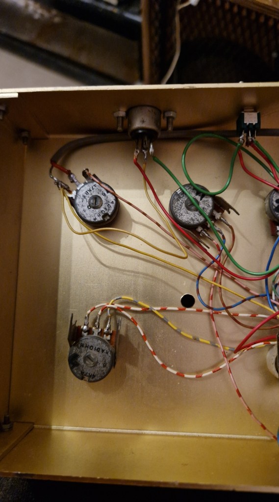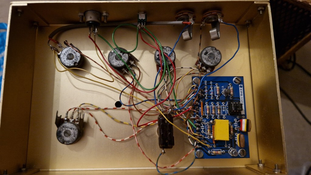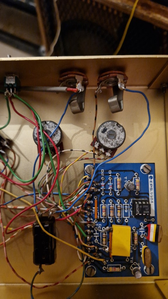This pedal came in not working correctly. The former builder mistook one potmeter for a wrong value and kinda messed up. With the original schematic and my own schematic I could easily trace the problem. In the end I replaced all potmeters as all potmeters were scratchy.