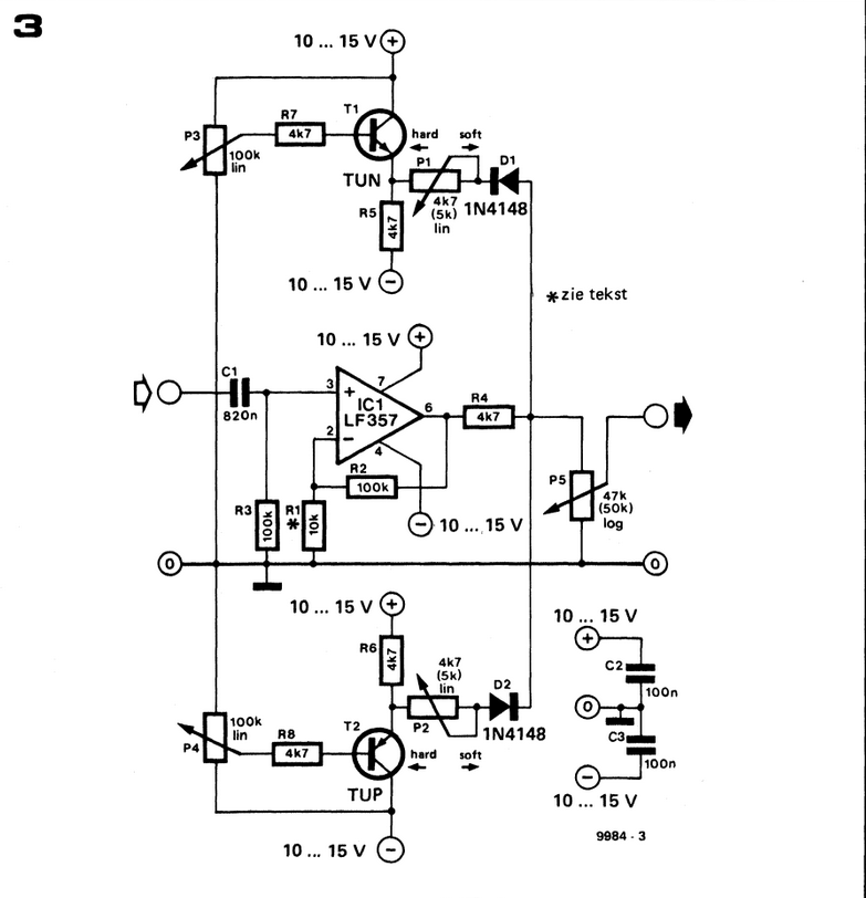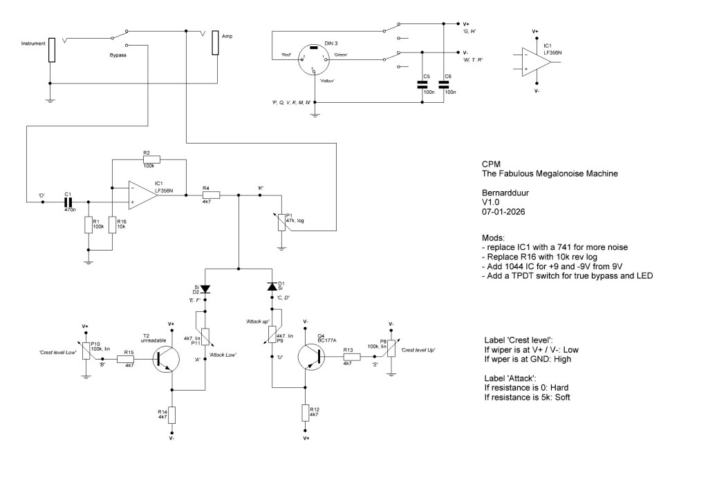 For the non-Dutch readers: it is a standalone dirt pedal that takes clipping to the next level. The pedal was designed to alter the clipping of the upper and lower part of the input wave independently by adjusting the character of the clipping (called ‘Attack’: hard clipping or soft clipping) and the amount of clipping (called ‘Crest level’). It is fed with a bipolar PSU but in the articles a version with is also available with only a single 9V power supply.