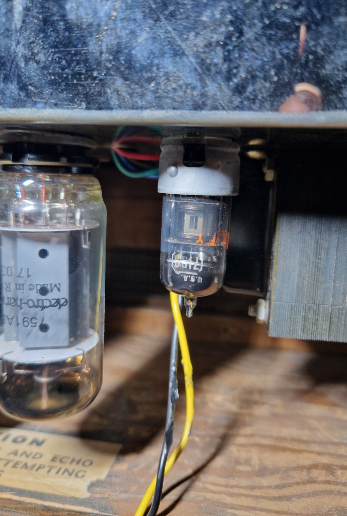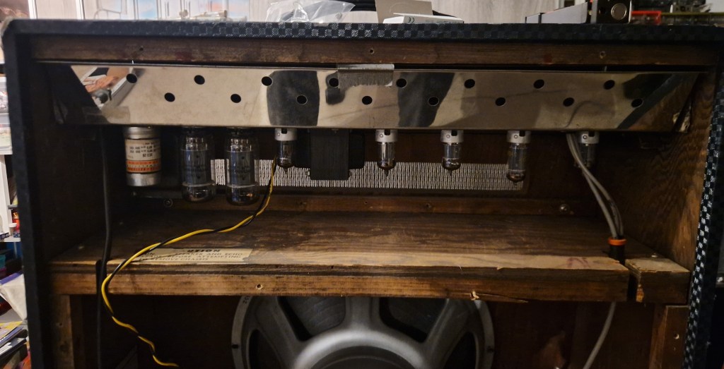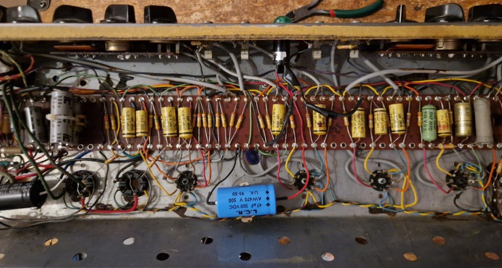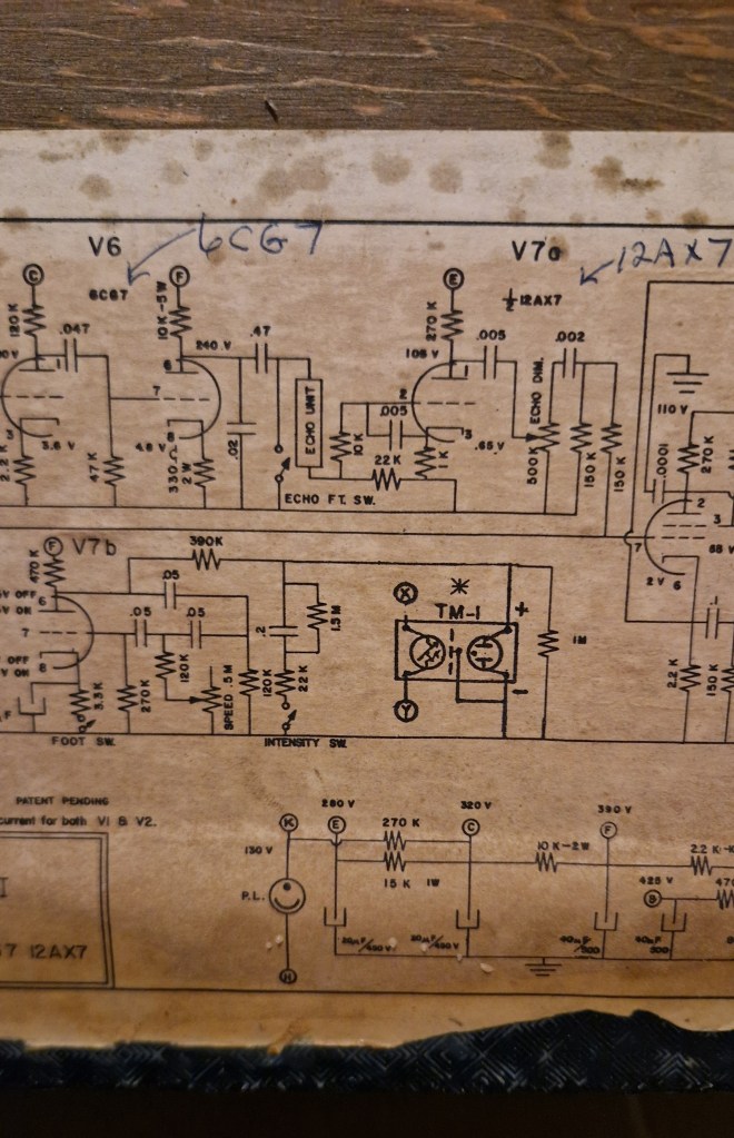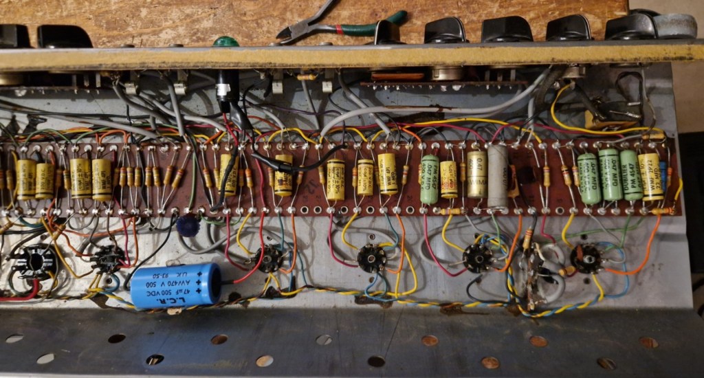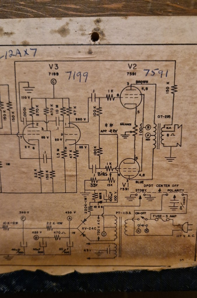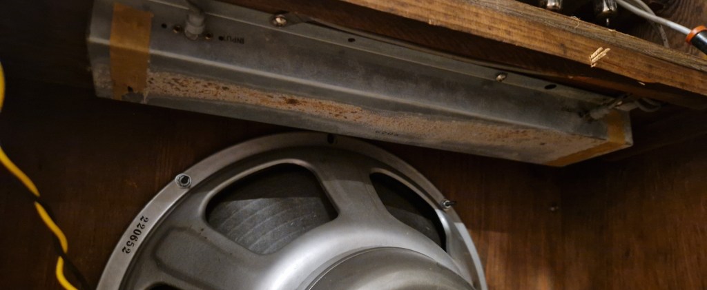Opening up the amp shows this great 60’s Ampeg vibe. From the back the amp looks incredible with that enormous speaker, the hidden reverb tank (mounted upside-down) and the various tubes. Removing the backplate revealed the original schematic of this amp, something I am Ampeg grateful for. Removing the chassis from the amp was easy (no screws were used to secure it) and the inside oozes with vintage Ampeg vibes. A can capacitor is clearly visible underneath the chassis. Some electrolytic capacitors were replaced in the past. The cap on the mid connection of the heater supply was bypassed with a 10 microfarads cap where the original called for a 100 nanofarads cap. The death cap was already removed and a grounded plug was already attached to the chassis.