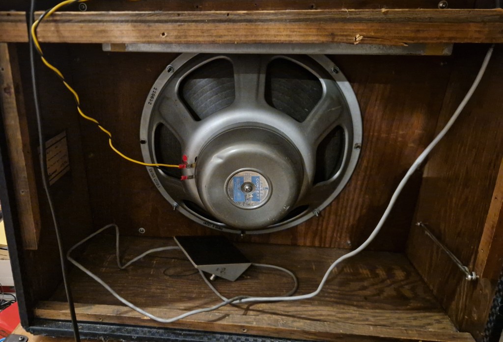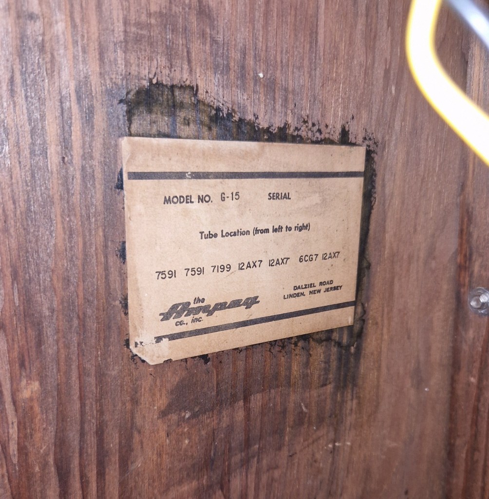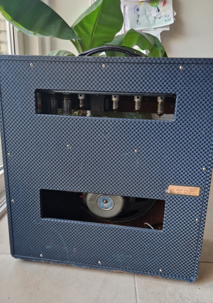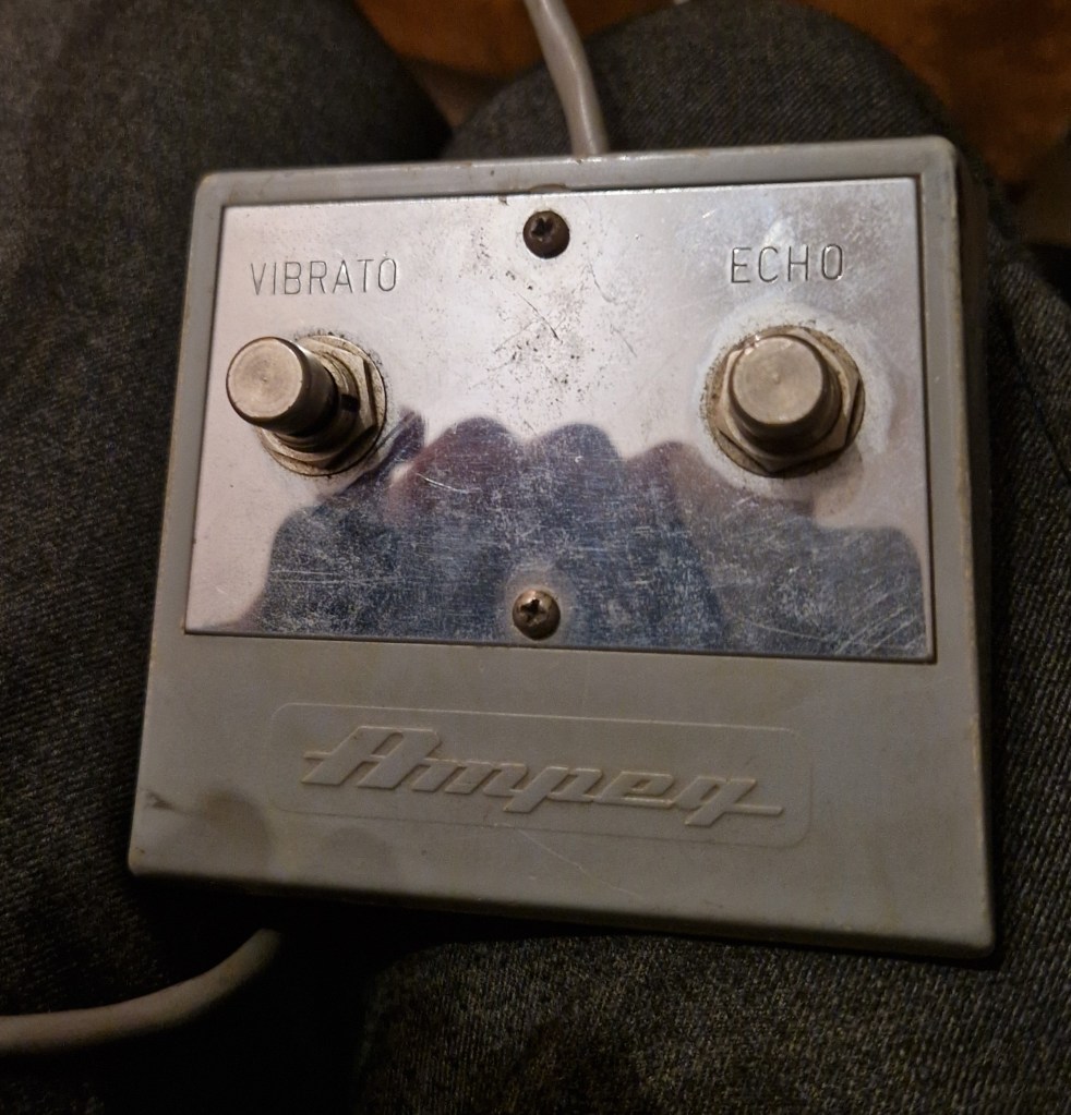 Ampeg introduced this amp as the first amp that had it’s controls facing forward but also introduced a ported cabinet design. In this design the speaker is in it’s own enclosure beneath the amplifier (fully surrounded by wood); the back is fully closed except from a small opening in the back acting as a port. Removing the back cover of the amp resulted in a different sounding amp altogether.