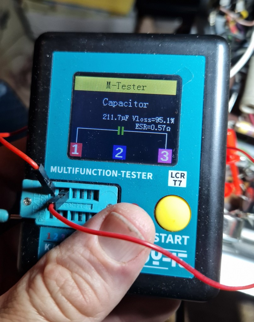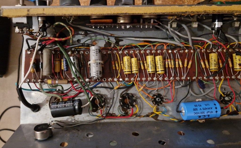 The amp came in blowing fuses. It was originally specified for a T, 3A fuse but inside was a (blown) F 5A fuse. Opening up the amp made clear that someone already partially serviced the amp but did a lousy job (looks like leftover capacitors that were soldered to the original leads of the old caps). Also the vintage can capacitor was still in the action although the former technician soldered both capacitors (in the can-capacitor two capacitors are available) in parallel thus doubling the capacity. Measuring all caps made clear that both the original and the newer caps were not well and needed replacement.