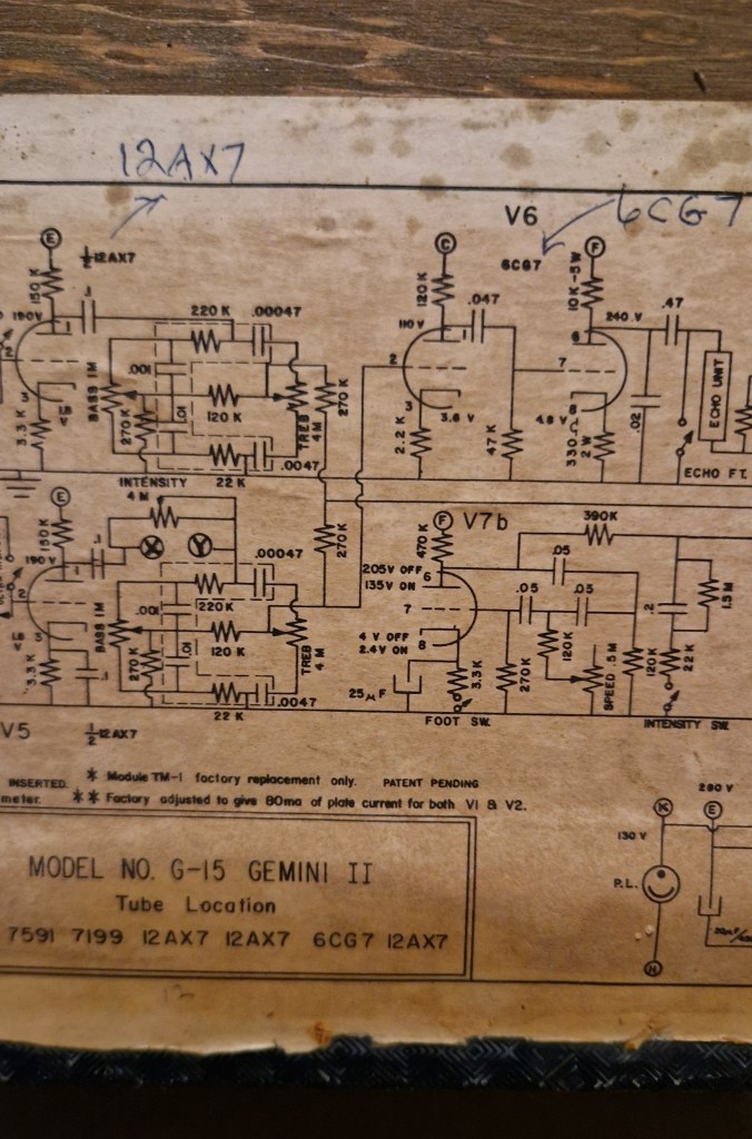 The phase-inverter tube used in this amp, a 7199, is even harder to find than the output tubes, since none are in production anywhere today, and supplies of NOS tubes are drying up fast. But don’t panic – there’s an easy fix. Moving three wires on this tube’s socket lets it use a more-plentiful 6U8A tube in place of the 7199, for comparable – and possibly improved – performance. As for the phase-inverter circuit, Ampeg used a rendition of the split-phase (a.k.a. cathodyne) inverter with a driver stage in front of it, as employed in Fender’s 15- to 30-watt tweed amps in the late ’50s like the Super, Pro, and Deluxe, and the Princeton throughout the blackface and silverface years. This topology is prone to some clipping, and might be partly responsible for the Gemini II’s fat crunch when cranked up, so it’s a wonder Ampeg didn’t use a cleaner, bolder long-tailed pair inverter… go figure.Ampeg purportedly moved to the “new” 7868 output tubes because they were the latest upgrade from Sylvania to the 7591s they had previously used, and were said to be similar performance-wise. What might have seemed a propensity to predict which tubes would be difficult for future owners to acquire – and then go with those – was more likely just an effort to keep abreast of the latest tube technology, along with a drive to be different from the pack. If you want to get your own vintage Gemini II pumping on something more standard, and more readily available, a good tech should be able to convert it to use 6L6s, though that’s likely to alter its original voice somewhat (in ways we can’t entirely predict).