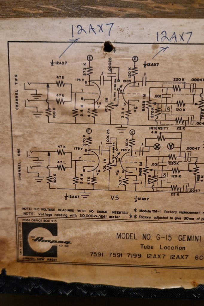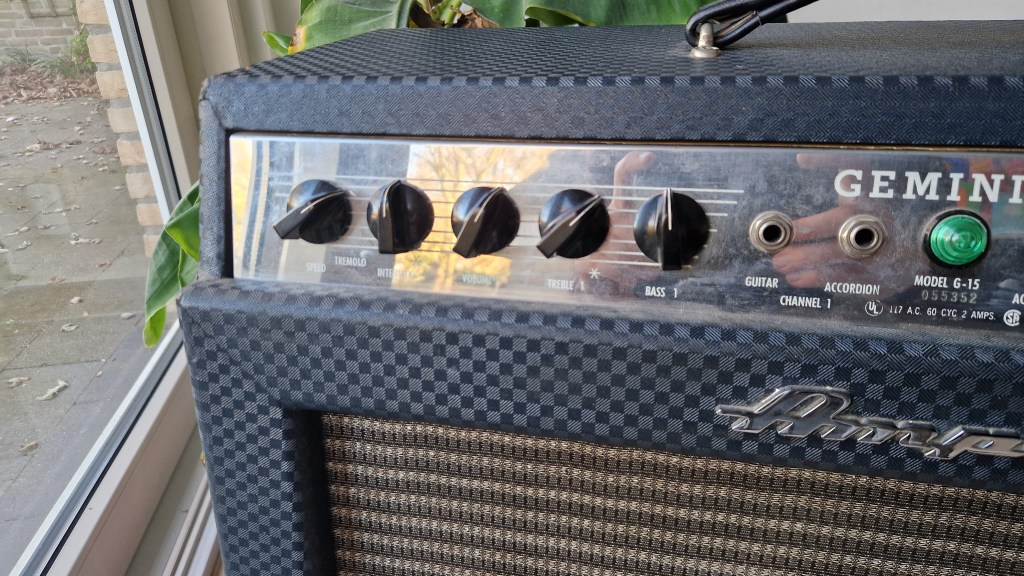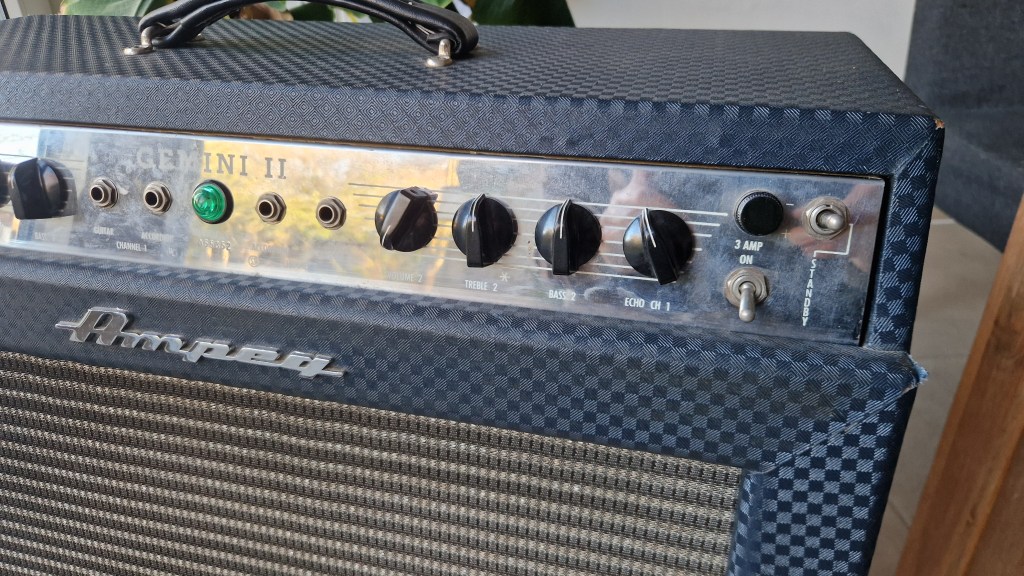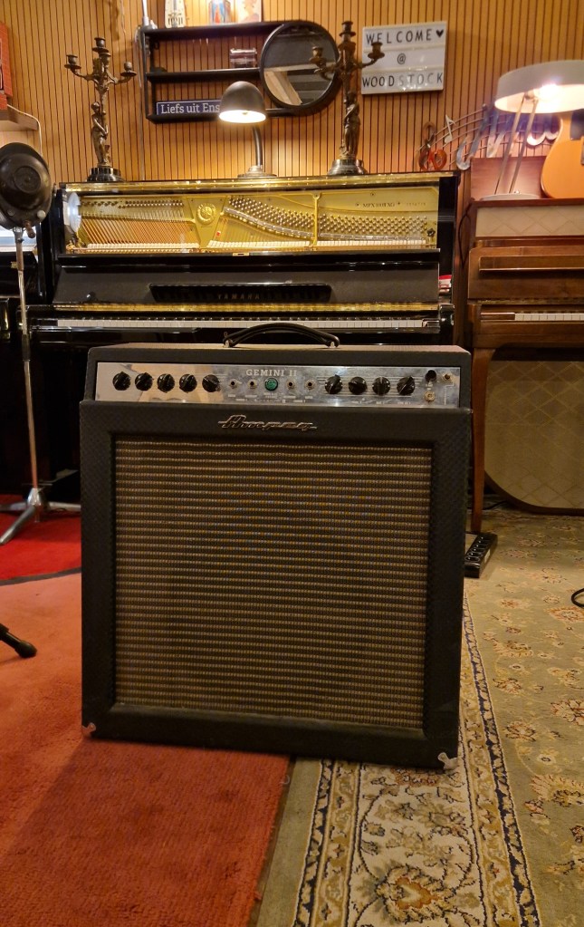 Ampeg produced a lot of nice guitar amps in the 60’s and this is one of them. The Gemini I was introduced in 1964 as a 22W deluxe amplifier focusing on clean output power. In the Gemini II the kathode biased poweramp was replaced by a fixed bias power section getting 30W of clean power into a single Jensen 15″ speaker (the amp was also available with a JBL speaker, called the Gemini IIL) with onboard reverb and tremolo (and a hidden repeat percussion). These features make this amp an absolute workhorse! Originally released in two versions this amp is a clear example of the first edition with the known 7591 tubes in the poweramp. A manual of the amp can be found on the Ampeg website.