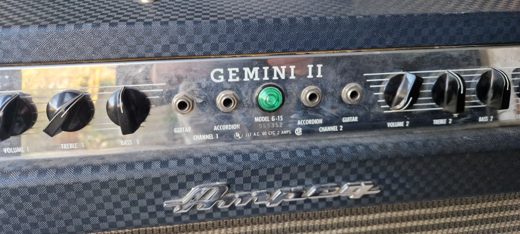 This amp looks amazing! It is heavy due to the HUGE speaker but the cabinet is made with decent and quality wood adding to the weight. The amp features two individual preamps (with individual EQ and volume knobs) each with an input for guitar (full input) and an input for accordion (padded input). Channel one features the onboard tremolo, reverb and repeat percussion effect while the second preamp has no additional effects for the clean sound vibe. The manual states that more instruments can be used per preamp but that this can cause a volume dip. The amp has controls for EQ (‘Treble’ and ‘Bass’) and level (‘Volume’) for both channels but channel 1 also has controls for the reverb (called ‘Echo’) and tremolo (‘Speed’ and ‘Intensity’ for speed and depth). Little stars on the chassis determine a switch; on the treble potmeters a switch is located at the most max position which switches a ‘Bright’ cap (making the channel even more brighter), on the tremolo’s ‘Intensity’ control a little star is present at the maximum intensity location. This switches the repeat percussion effect (some sort of drastic tremolo effect). On the faceplate a switch is located to turn the amp on and a second switch determine the polarity of the deathcap but also features a standby function in the middle position. I would advise you to remove the death cap and playing through a grounded power supply.